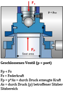 Die Federkraft (Fs) wird über die Spindel auf den Teller übertragen. Der Teller schließt gegen die Sitzbuchse, solange die Federkraft größer ist als die Kraft, die durch den Druck am Eintritt des Ventils entsteht (Fp). Ist. Sind die Kräfte Fs und Fp ausgeglichen, liegt der Ansprechdruck vor. Das Ventil öffnet und der Druck reduziert sich. Ist die Federkraft Fs wieder größer als Fp beginnt das Sicherheitsventil sich wieder zu schließen.
