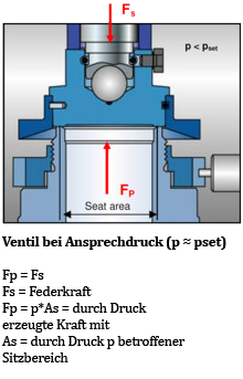 Im Falle einer Störung öffnet das Ventil bei einem festgelegten Ansprechdruck. Die Federkraft Fs wirkt in Schließrichtung und Fp, die Kraft, die durch den Druck am Eintritt des Sicherheitsventils entsteht, wirkt in Öffnungsrichtung. Beim Ansprechdruck sind die Kräfte Fs und Fp ausgeglichen. Es gibt keine resultierende Kraft um den Teller unten auf dem Sitz zu halten. Das Sicherheitsventil wird sichtlich oder hörbar öffnen (erstes hörbares Geräusch).